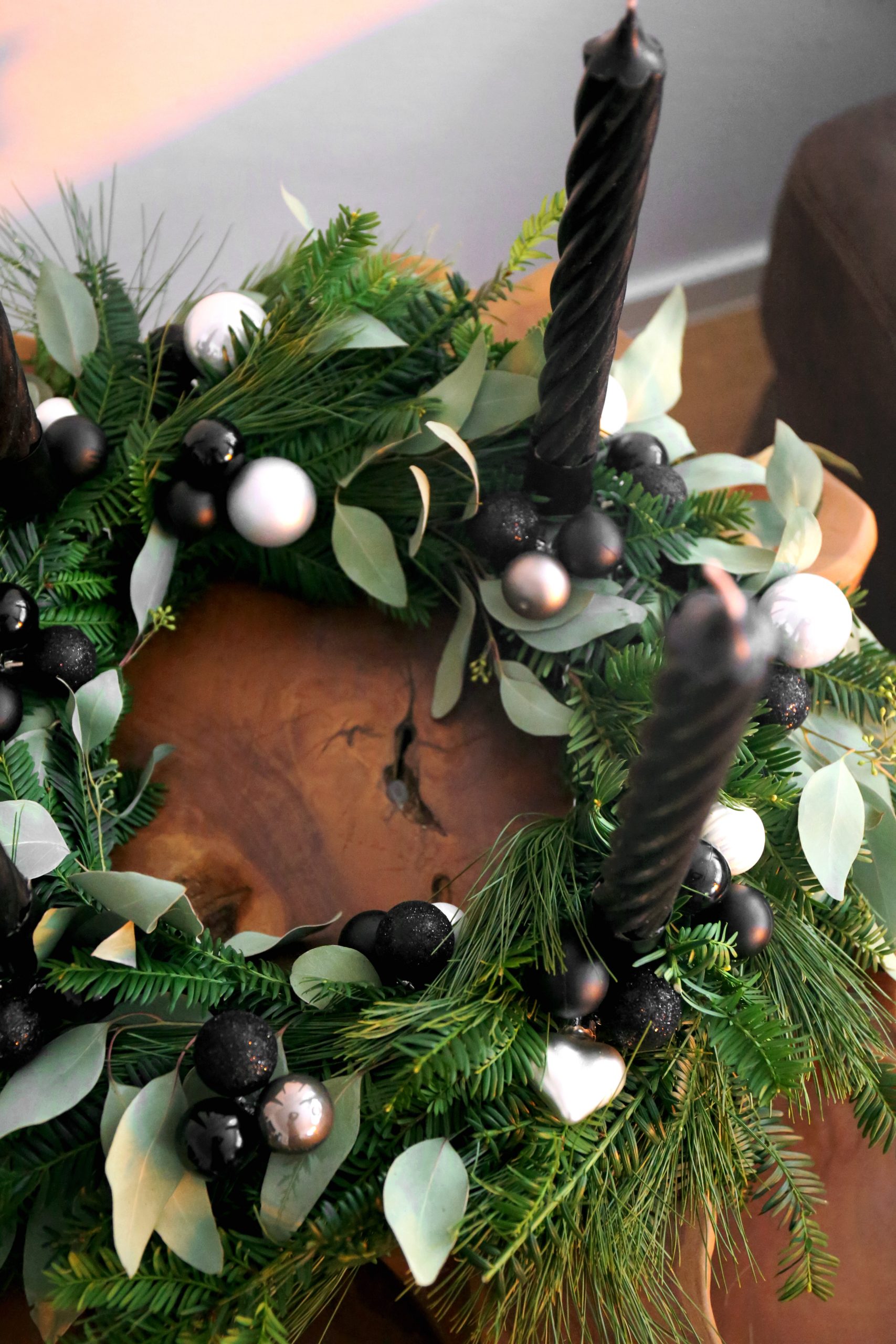 Als erster To-Do-Punkt war – Das Adventskranz-Basteln. Bis zum Ereignis hatte ich einfach überhaupt keine Ahnung, was ich für eine Deko-Richtung, -Farbe … etc. haben will. Das kam beim Einkaufen für das Basteln von selbst. Dunkel, möglichst einfarbig und schlicht sollte es sein. Ich entschied mich für Schwarz. Schwarze Kerzen, schwarze Kugeln, ein paar andersfarbige Akzente mussten aber sein, da ich nicht alles neu kaufen wollte. Etwas weiß und grau kamen noch hinzu und ergänzten das Gesamtbild meiner Meinung nach ganz gut.