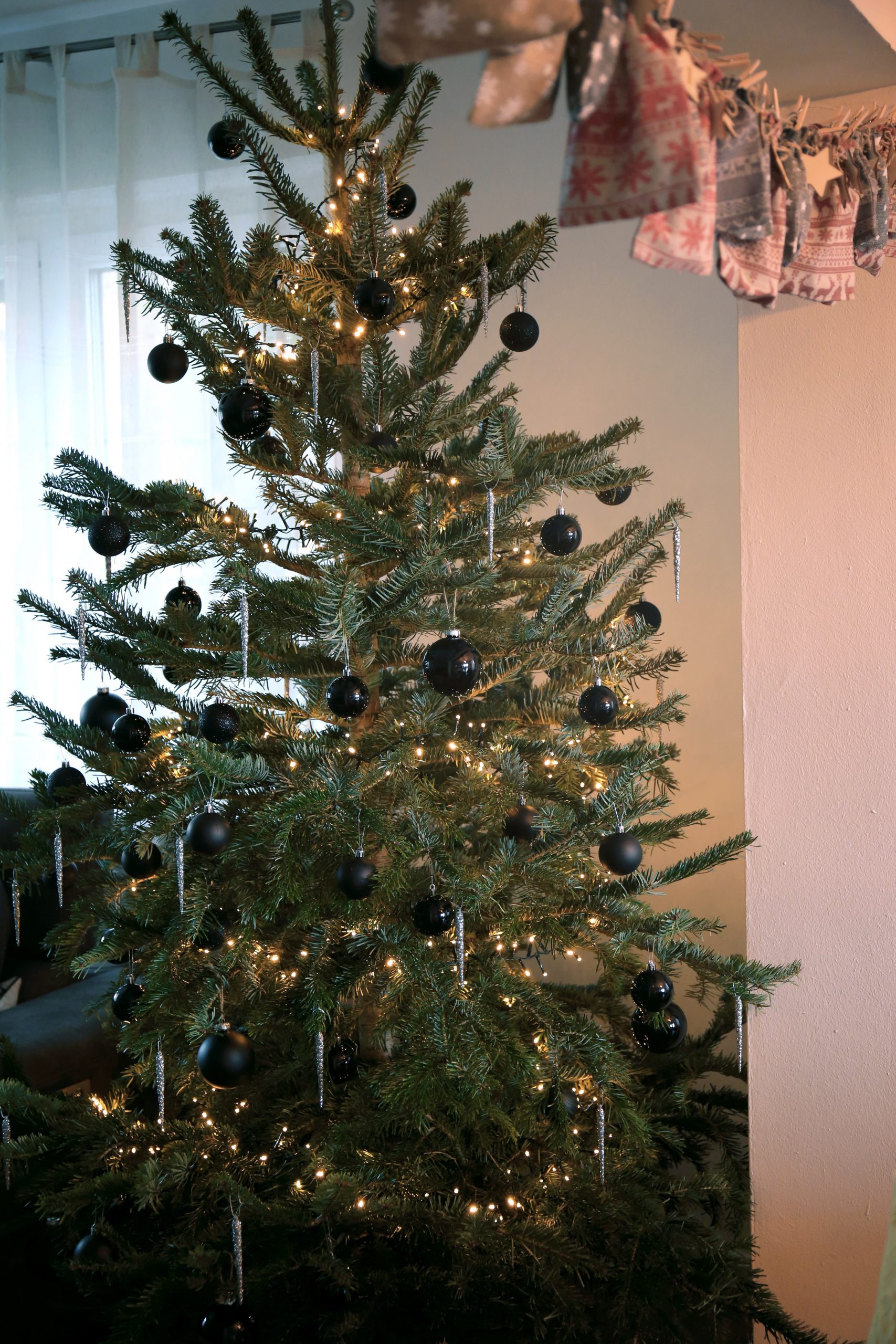Auch für den Baum haben wir uns schwarze Kugeln gekauft in Groß und Klein, in matt und glänzend. Doch nur mit den Kugeln erschien uns der Baum als etwas langweilig, irgendetwas stimmt nicht und fühlte sich nicht richtig an. Also fügten wir noch silberne Eiszapfen hinzu – Das war es! Jetzt passte es!