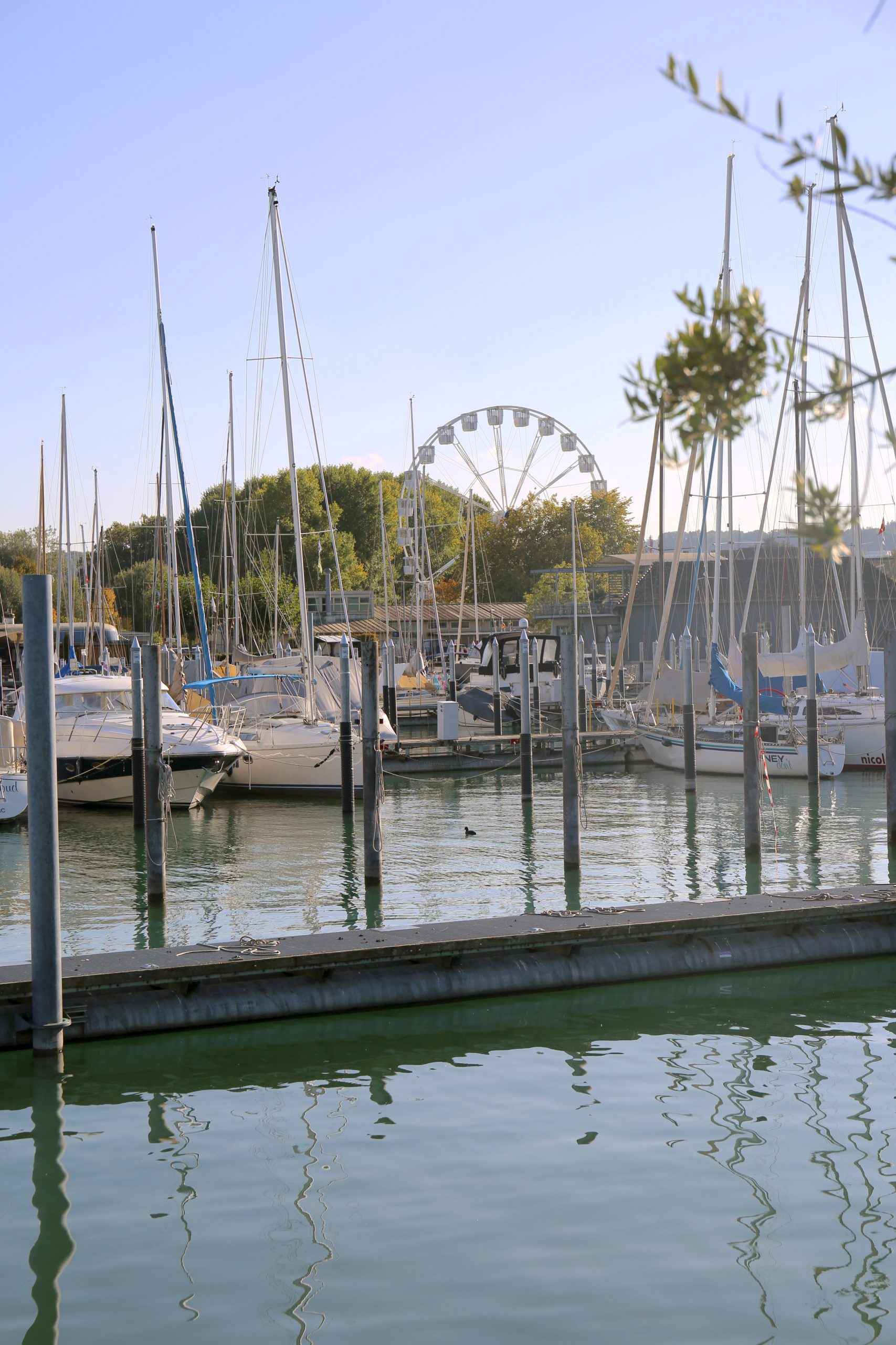 Als wir in Konstanz ankamen, fühlte sich alles nach Sommerzeit an. Die Sonne strahlte so herrlich. Die vielen Boote am Hafen wiegten sich so beruhigend auf dem See. Es war nicht ganz so viel los – herrlich! So mag ich den Bodensee! Bei einem Spaziergang entlang der Promenade war unser Sohn auf die vielen vielen Boote fixiert. Er war gänzlich aus dem Häuschen, wenn eine Fähre an uns vorbeibrauste. Also entschlossen wir uns für einen Mittagssnack direkt am Hafen. Moritz hatte uns fast gar nicht beachtet, die See und die Umgebung war viel interessanter. So konnten wir gemütlich unseren Mittag am See bei einem leckeren Glas Riesling genießen. Der Wein schmeckte bei der Kulisse vorzüglich und selbst die gewöhnlichen Pommes hatten das gewisse Extra.